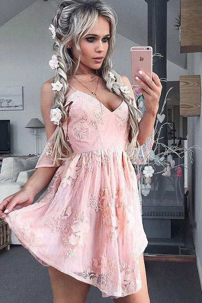 v-neck spaghetti straps pink lace short homecoming dress for girls, BD3804