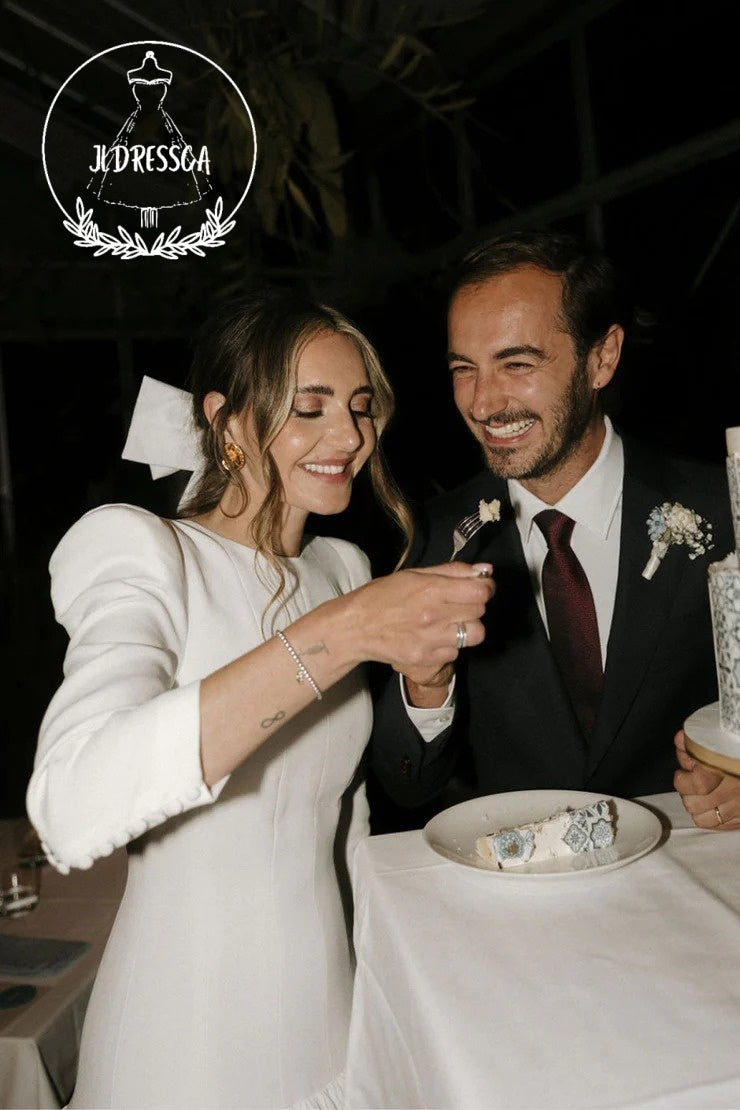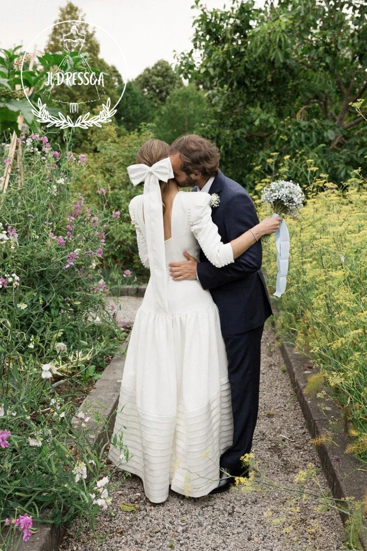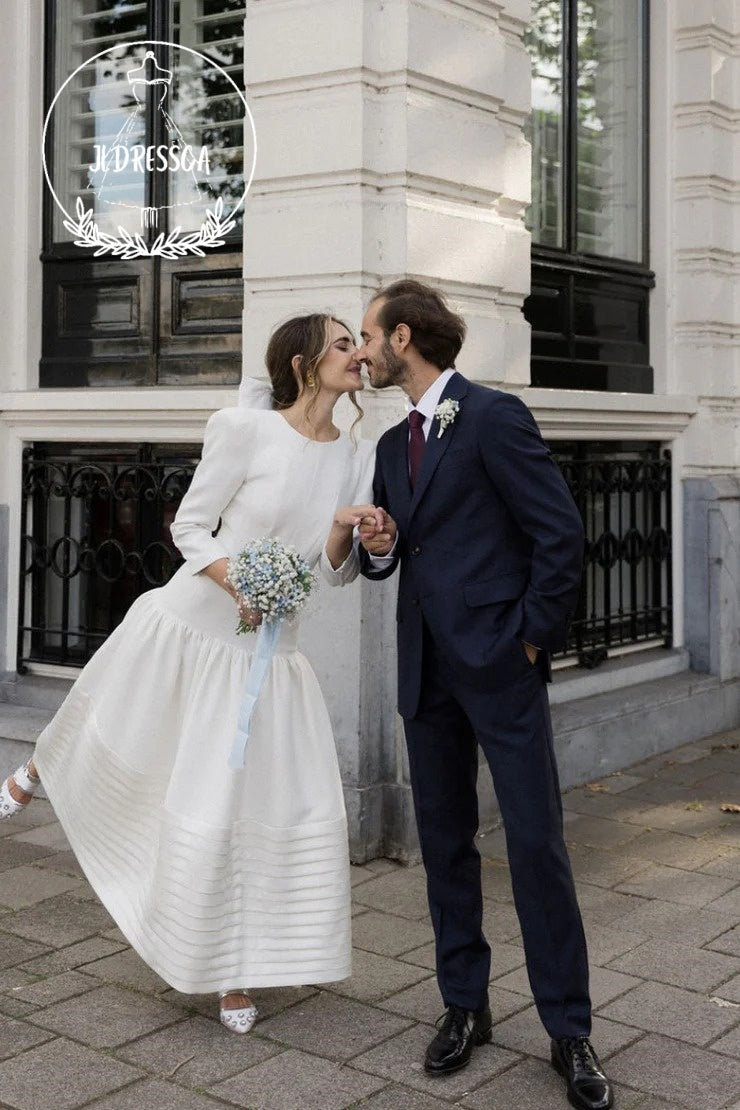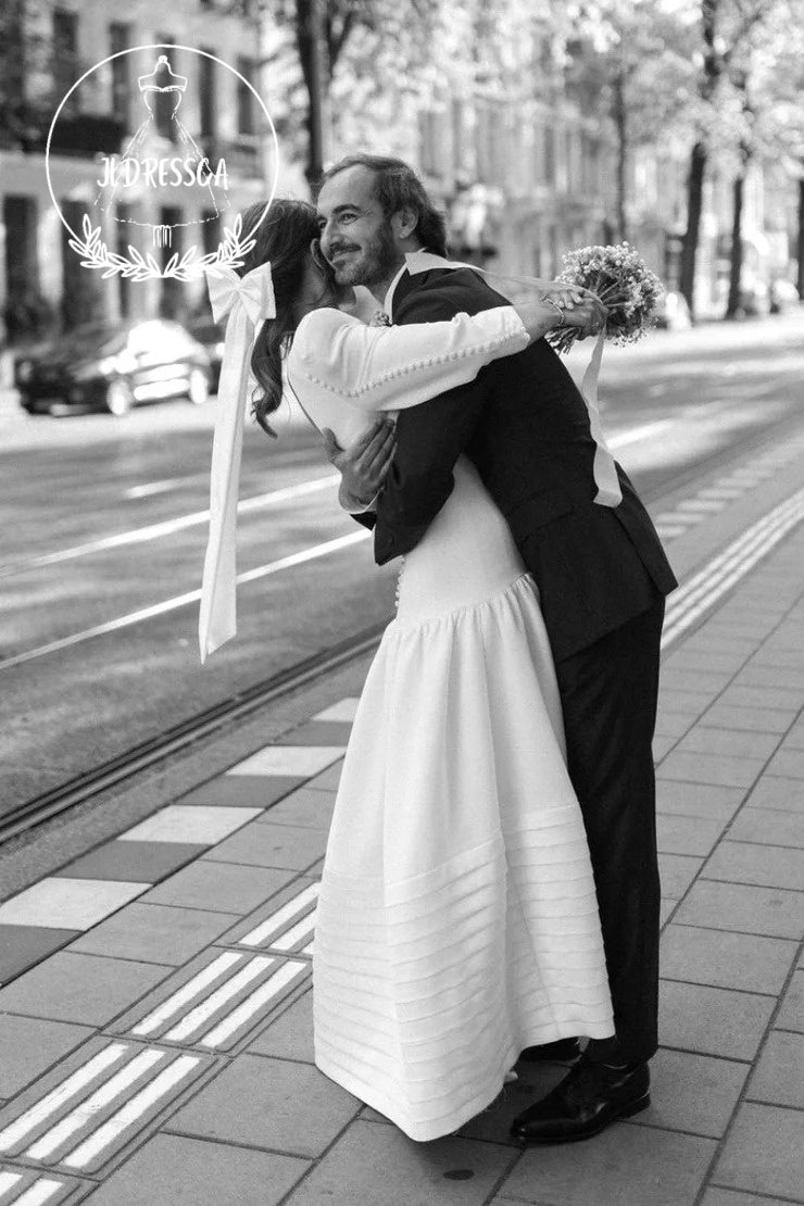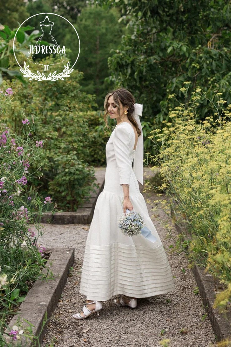 This vintage satin wedding dress features a classic A-line silhouette, a round neckline, and elegant long sleeves. The luxurious fabric and timeless design create an effortlessly stylish look for your special day. With its flattering shape and sophisticated details, this dress is the perfect choice for any bride looking for a timeless and elegant wedding dress.