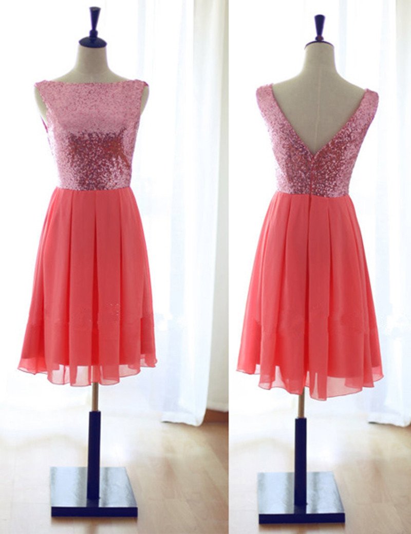 Watermelon Bridesmaid Dress, Knee-length Bridesmaid Dress,Chiffon Bridesmaid Dress,Sequined Bridesmaid Dress,Deep V-neck Back Bridesmaid Dress, PD0013