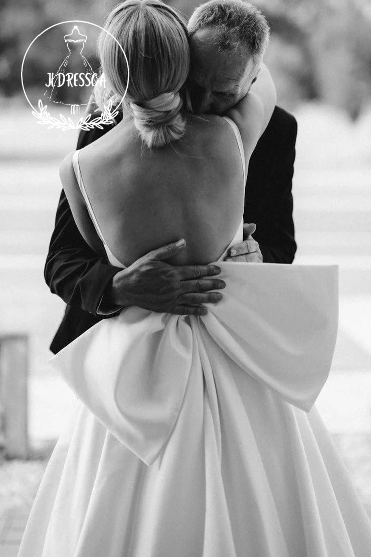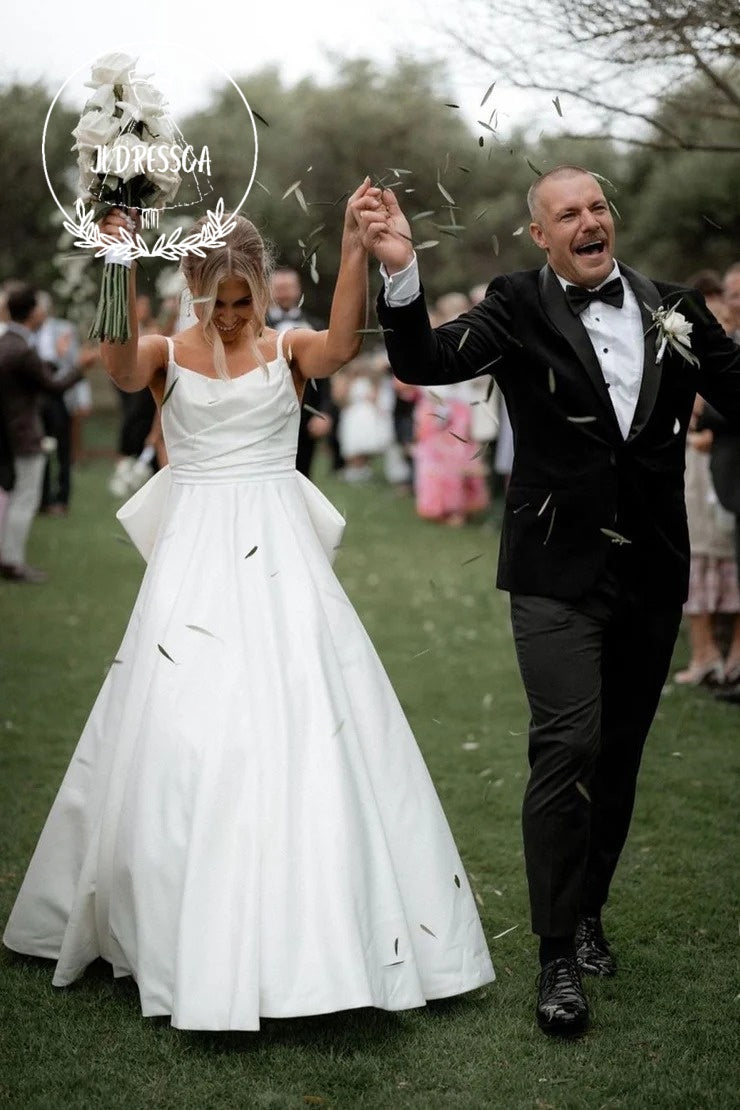 White A-Line Scoop Neck Satin Wedding Dress with Bow, WD25027