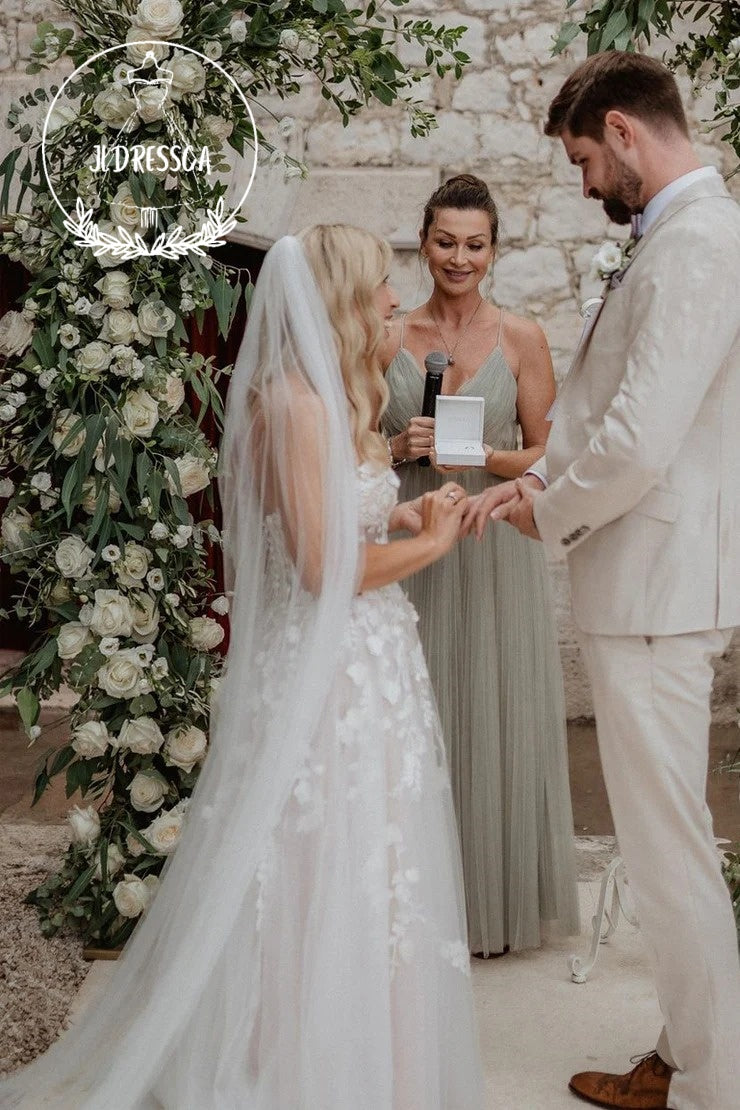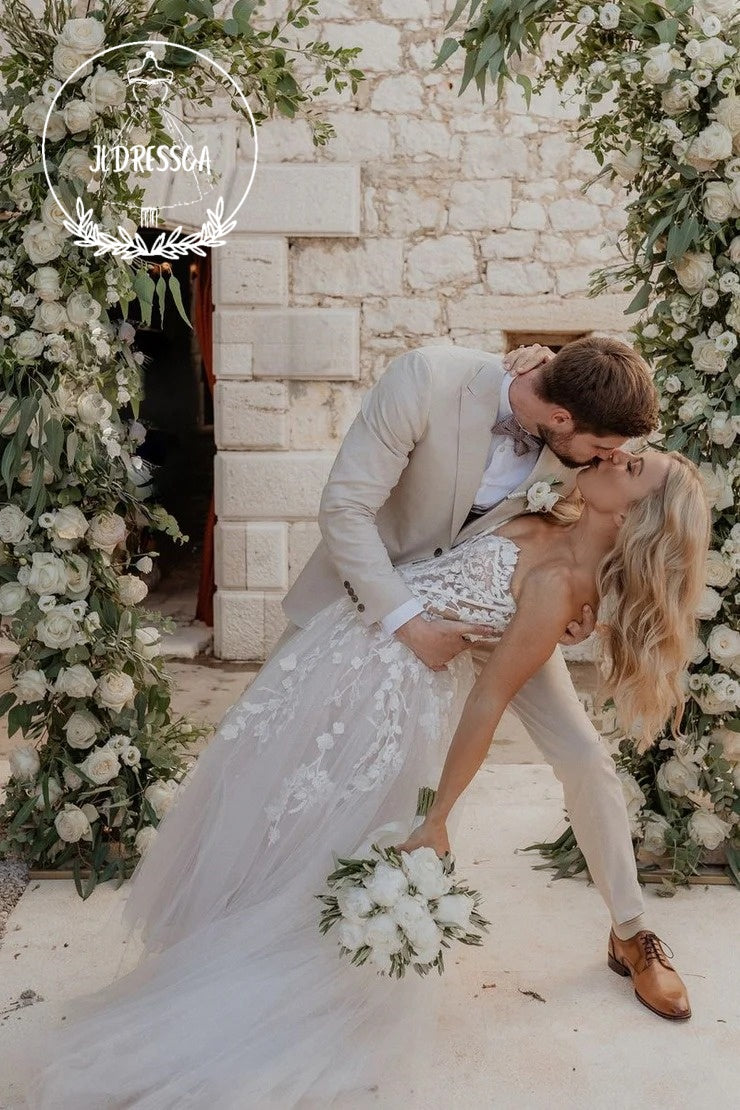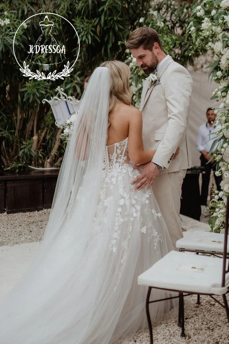 This stunning White A-Line Sweetheart Tulle Wedding Dress with Appliques features delicate appliques on a flowing tulle skirt, creating a romantic and timeless look. The sweetheart neckline complements all body types, while the A-line silhouette flatters the figure. A perfect choice for any elegant and classic wedding.