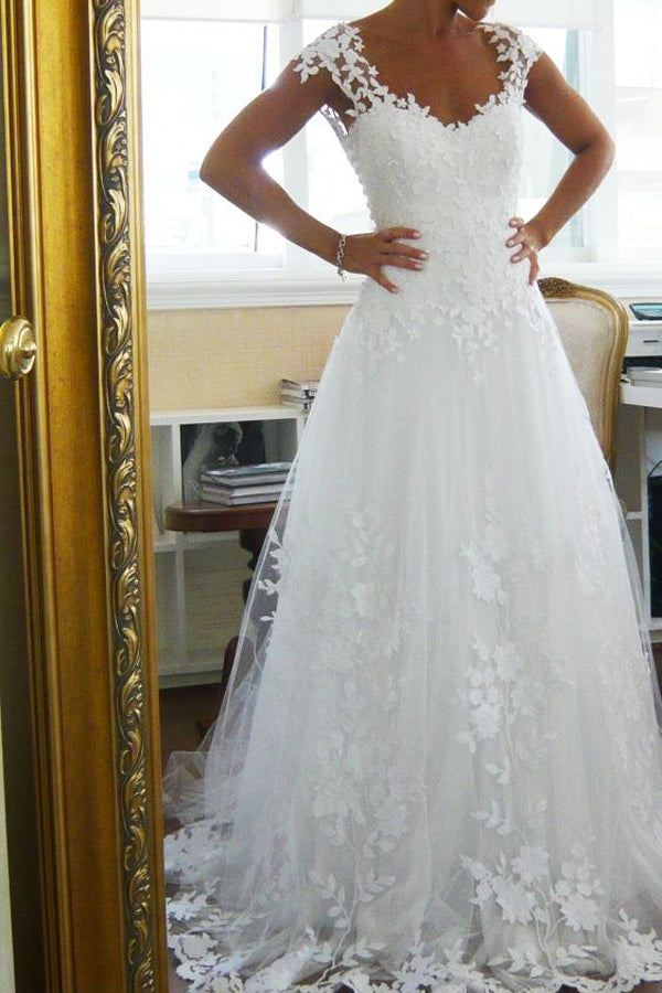 White Lace A-line Wedding Dress with V-neck and Brush Train, WD23030419